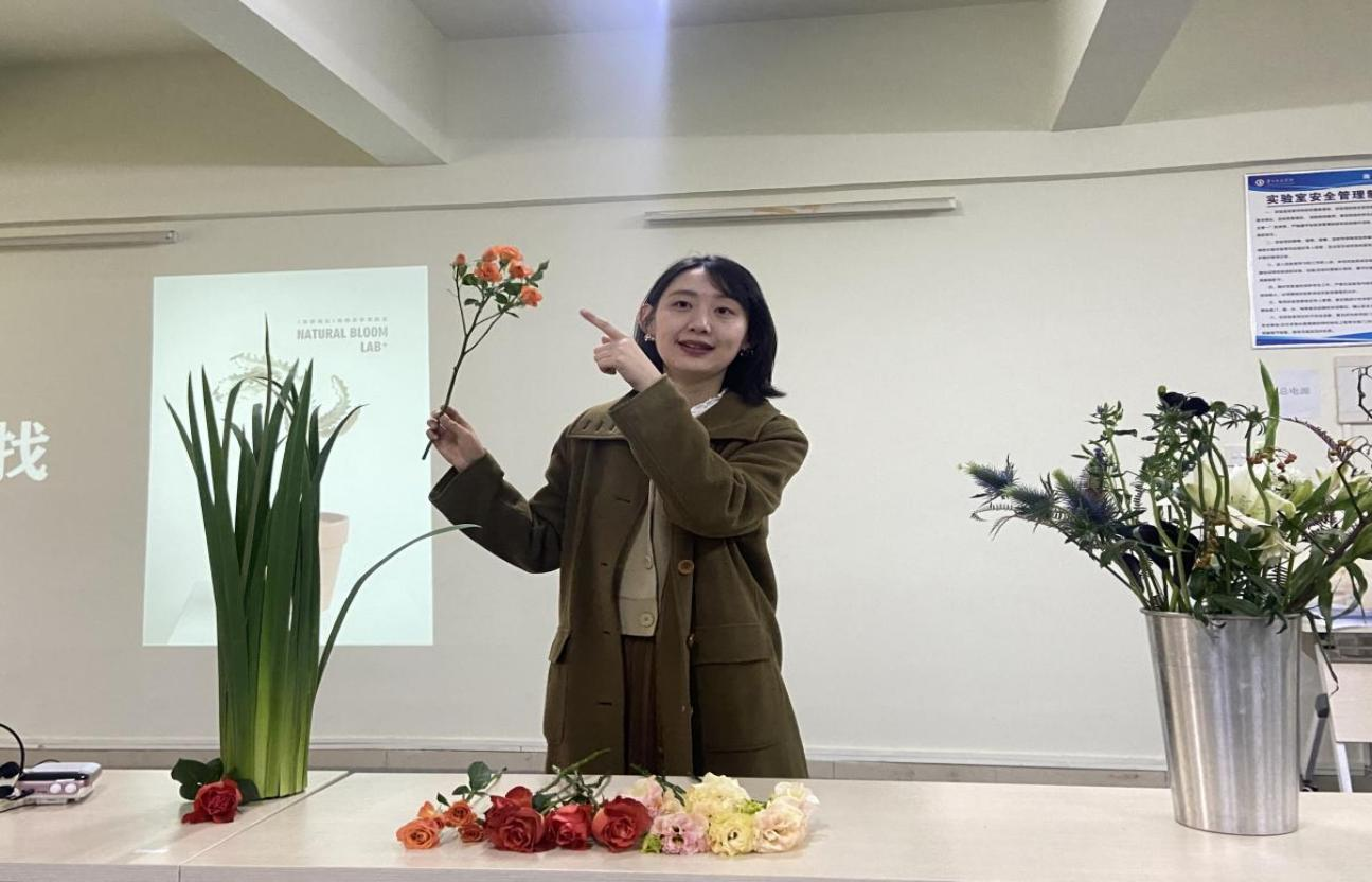 孔锶芃从自己的跨界经历说起,迅速将同学们带入了今天的主题——寻找自我表达的方式。随后,她向大家讲述了如何将艺术跟商业结合,从案例展示、创意的来源、怎样将终极目标与艺术手段合二为一等方面娓娓道来。接着,她让同学们欣赏了自己一系列的花艺设计优秀作品,分析美学对设计者独有的魅力。最后,孔锶芃与现场同学进行亲切互动,热情详细地为同学们解答各种问题,告知同学们设计与生活相关,要善于观察,对生活的理解都是日积月累的,要接触社会,勇于尝试。
