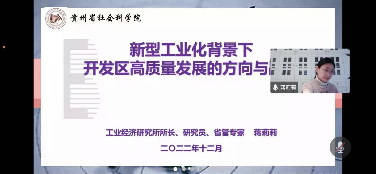 为了为营造良好的学术氛围,拓展学术领域,必赢76net线路邀请贵州省社会科学院工业经济研究所所长蒋莉莉为全院教师开展了“新型工业化背景下贵州高质量发展路径”的专题讲座,本次辅导讲座于12月5日下午通过“腾讯会议”平台开展,讲座由经理黄丹主持。